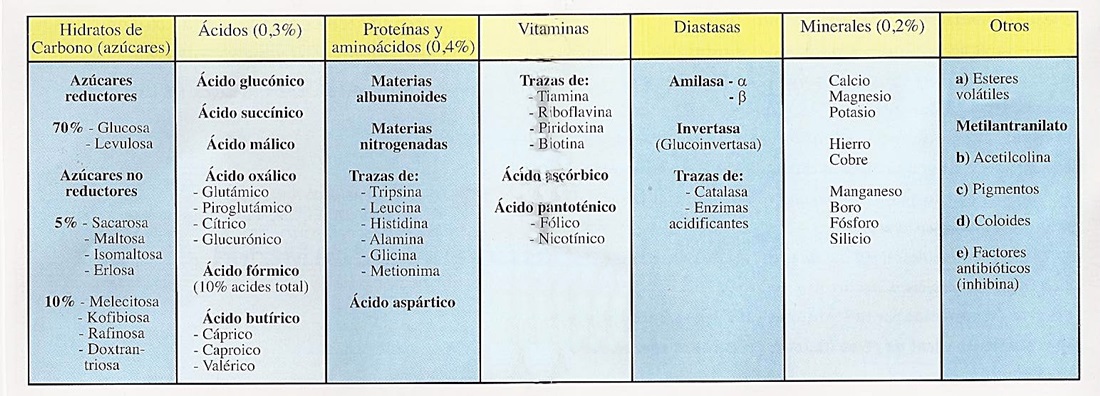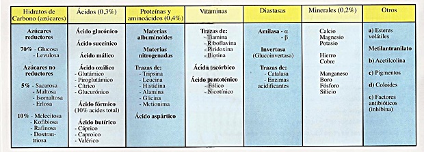 Aunque en su contenido la miel varía según las flores de las que procede, la composición, muy esquematizada, está compuesta por tres valores esenciales: hidratos de carbono, agua y minerales. Bajo esta aparente simplicidad se esconde la complejidad de un producto biológico vivo del que, sin duda, estamos lejos de conocer todos sus componentes.